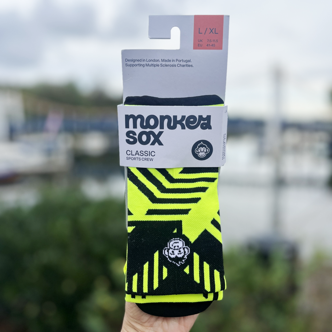 A performance sports sock with an abstract head turning design. Suitable for running, cycling and gym workouts. Designed to get everyone active! Combining comfort, performance, breathability and style.